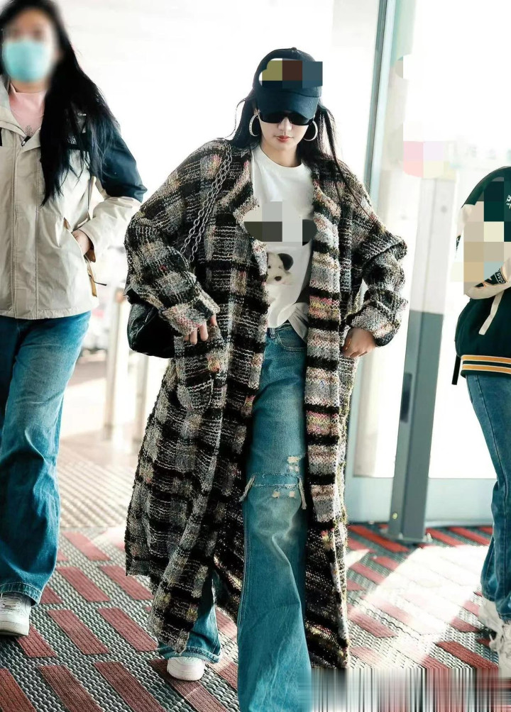 徐璐机场私服真会穿! 格子大衣+印花T+牛仔裤, 时髦减龄又高级
